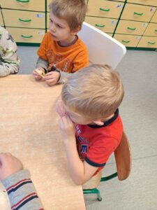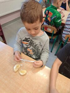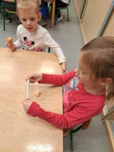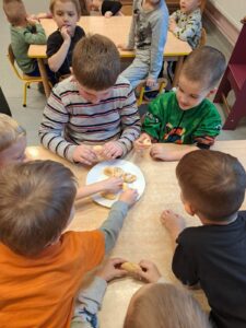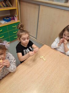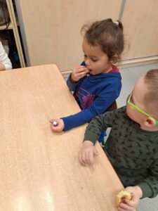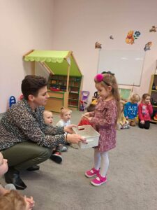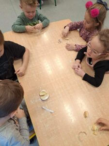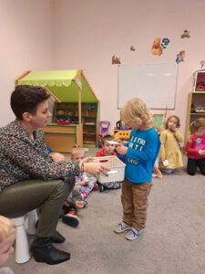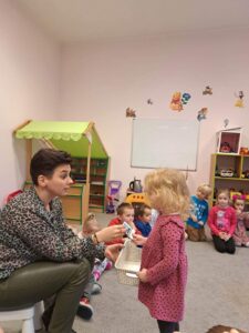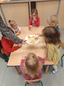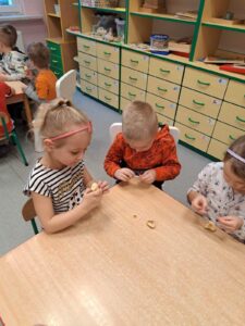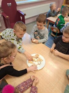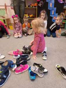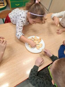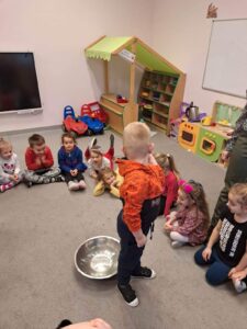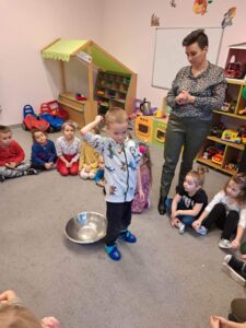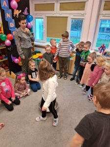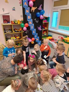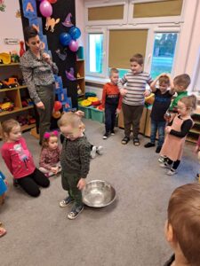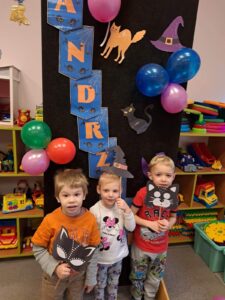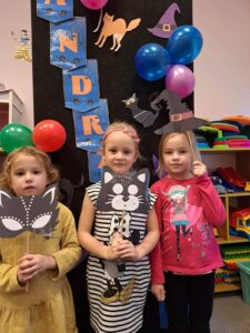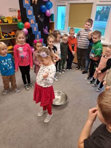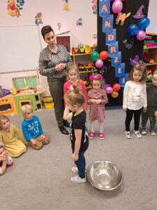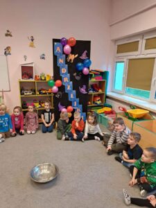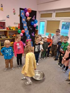 We wtorek, 29 listopada 2022 roku przedszkolaki przeniosły się w magiczny świat wróżb i zabaw andrzejkowych. Dzieci poznały znaczenie liczb oraz magicznych przedmiotów. Ustawiały buty, szukały ich właściciela, rzucały pieniążkami do miski z wodą, aby spełniły się najskrytsze marzenia. Za pomocą przygotowanych obrazków sprawdzały, kim zostaną w przyszłości. Wszystkie wróżby przeplatane były pląsami, tańcami przy muzyce. Na koniec czekał na dzieci słodki poczęstunek – ciastko z wróżbą. Ten magiczny dzień był okazją do zapoznania się z tradycją andrzejkową.