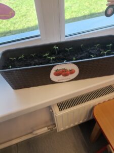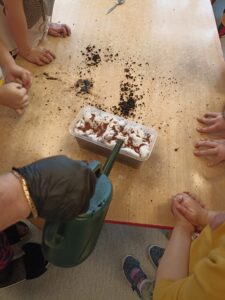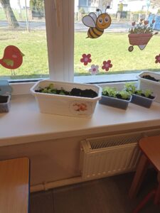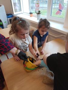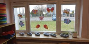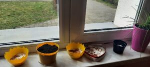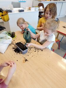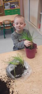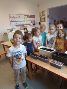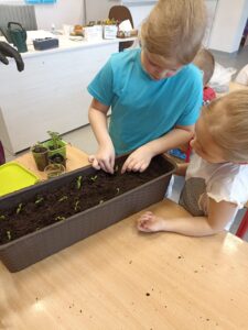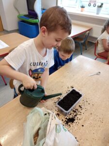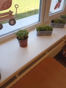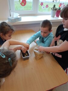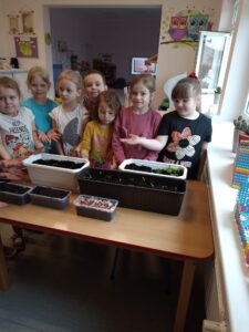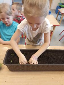 Chcąc przyśpieszyć przyjście wiosny nasze przedszkolaki postanowiły założyć w sali zielony ogródek. Zgromadziły potrzebne przybory ( pojemniczki, doniczki, konewki), ziemię i nasionka. Przed przystąpieniem do pracy poznały warunki potrzebne roślinom do wzrostu. Następnie w małych grupkach siały rzeżuchę, szczypiorek siedmiolatkę i pietruszkę oraz sadziły cebulkę na szczypiorek. Po zasianiu i podlaniu rośliny zostały umieszczone w kąciku przyrody, a dzieci muszą pamiętać o ich podlewaniu oraz obserwować ich wzrost. Kiedy wyrosną będą źródłem witamin na kanapkach.